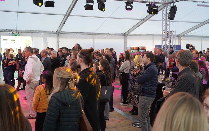 Im Festzelt auf der Campuswiese mit Lounge-Charakter erinnerten Schwarz-Weiß-Fotografien an die historische Nutzung der Gebäude zu den Zeiten der Jägerkaserne bis zu den Anfängen der heutigen Hochschule.