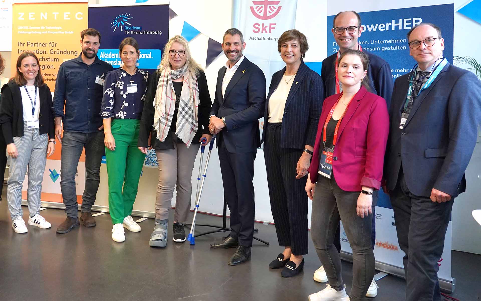 Foto (v. l. n. r.): Anna Dietz (TH Academy), Tobias Zenglein und Katrin Pfoh (beide ZENTEC), Christine Widmer (Geschäftsführerin SkF Aschaffenburg), Dr. Alexander Legler (Landrat), Prof. Dr. Eva-Maria Beck-Meuth (Präsidentin TH Aschaffenburg), Christian Kullick (operativer Geschäftsführer Arbeitsagentur Aschaffenburg), Anna-Lena Häcker (Arbeitsagentur Aschaffenburg), Prof. Dr. Erich Ruppert (Leiter TH Academy)
