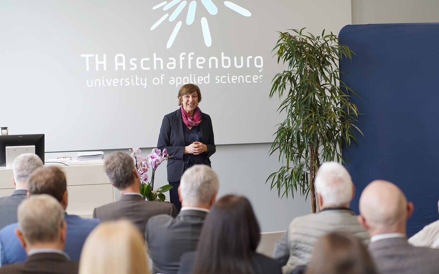 • TH-Präsidentin Prof. Dr. Eva-Maria Beck-Meuth begrüßt die Anwesenden zur Verleihung der Deutschlandstipendien an der Hochschule.
