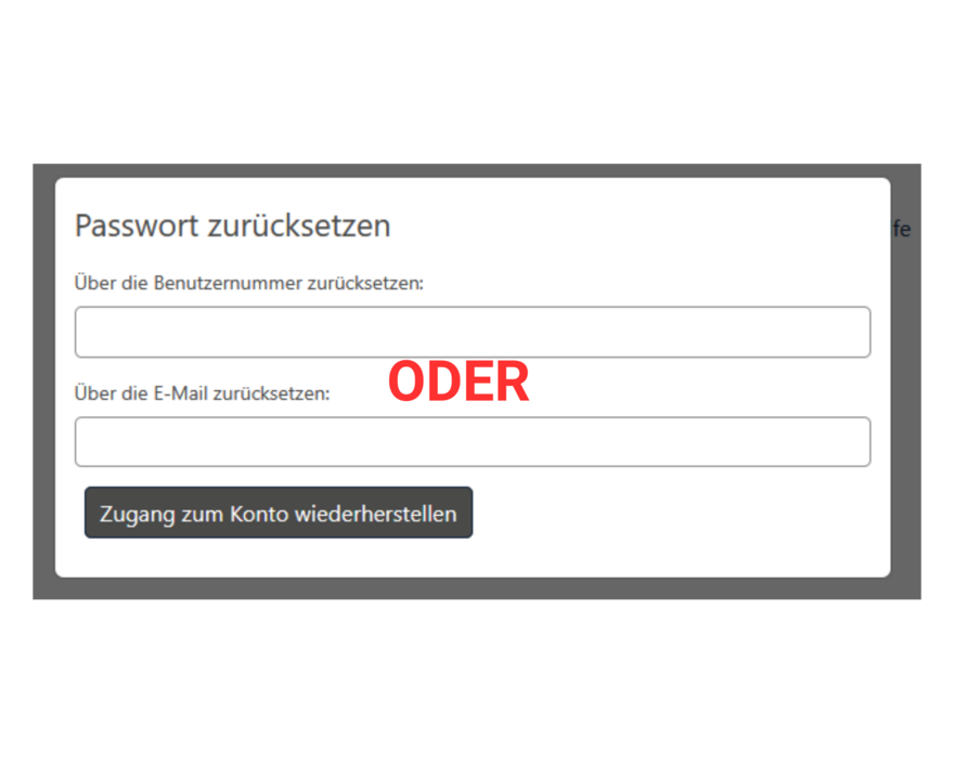 • Sie können nun ihr Passwort entweder über die Bibliotheksnummer auf ihrem Ausweis oder über die von Ihnen hinterlegte E-Mail-Adresse zurücksetzen. Wichtig ist, dass Sie nur eine der beiden Optionen ausfüllen und dann über den Button "Zugang zum Konto wiederherstellen" bestätigen.
