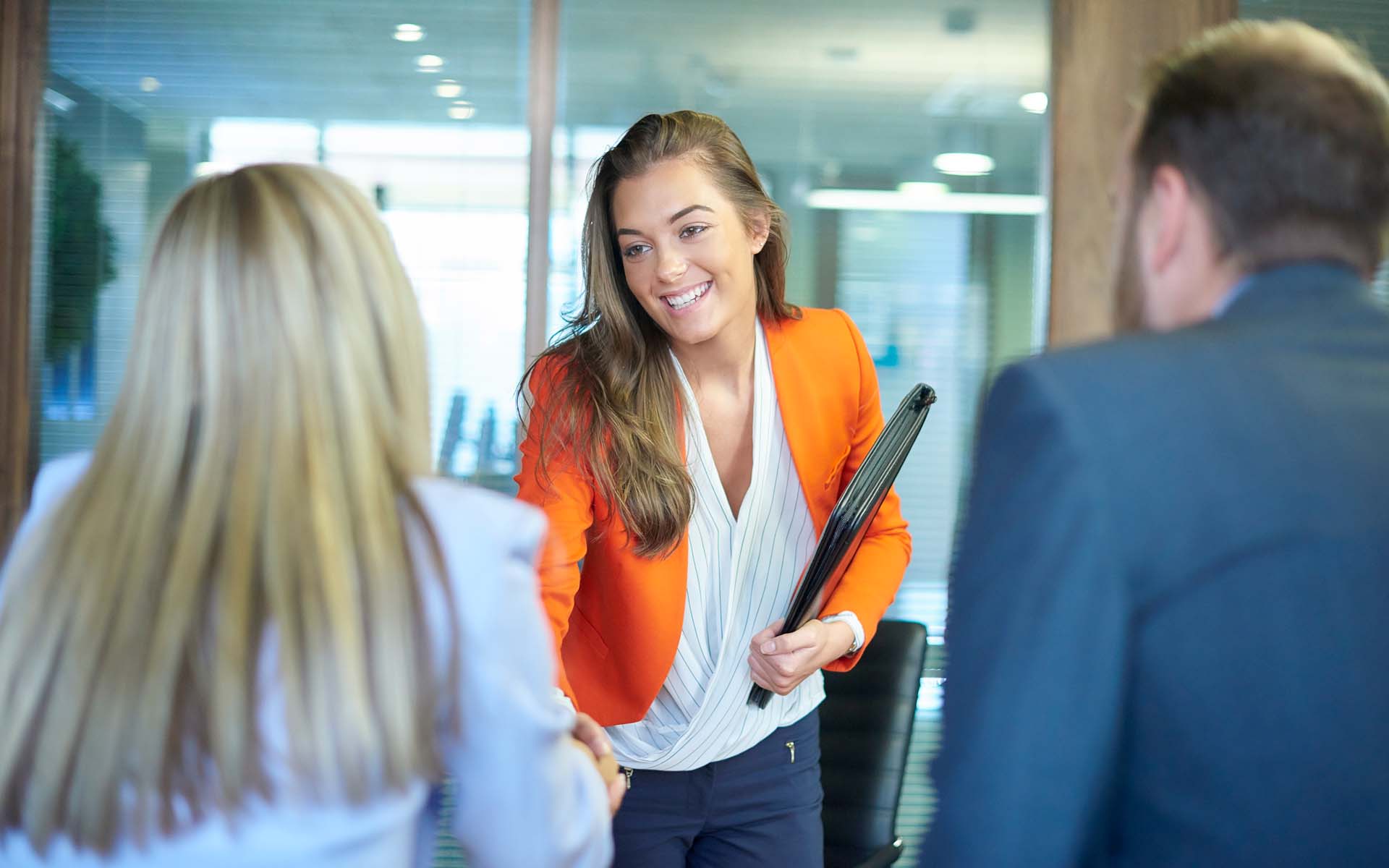 Junge Frau steht zwei Personen gegenüber und gibt einer die Hand.